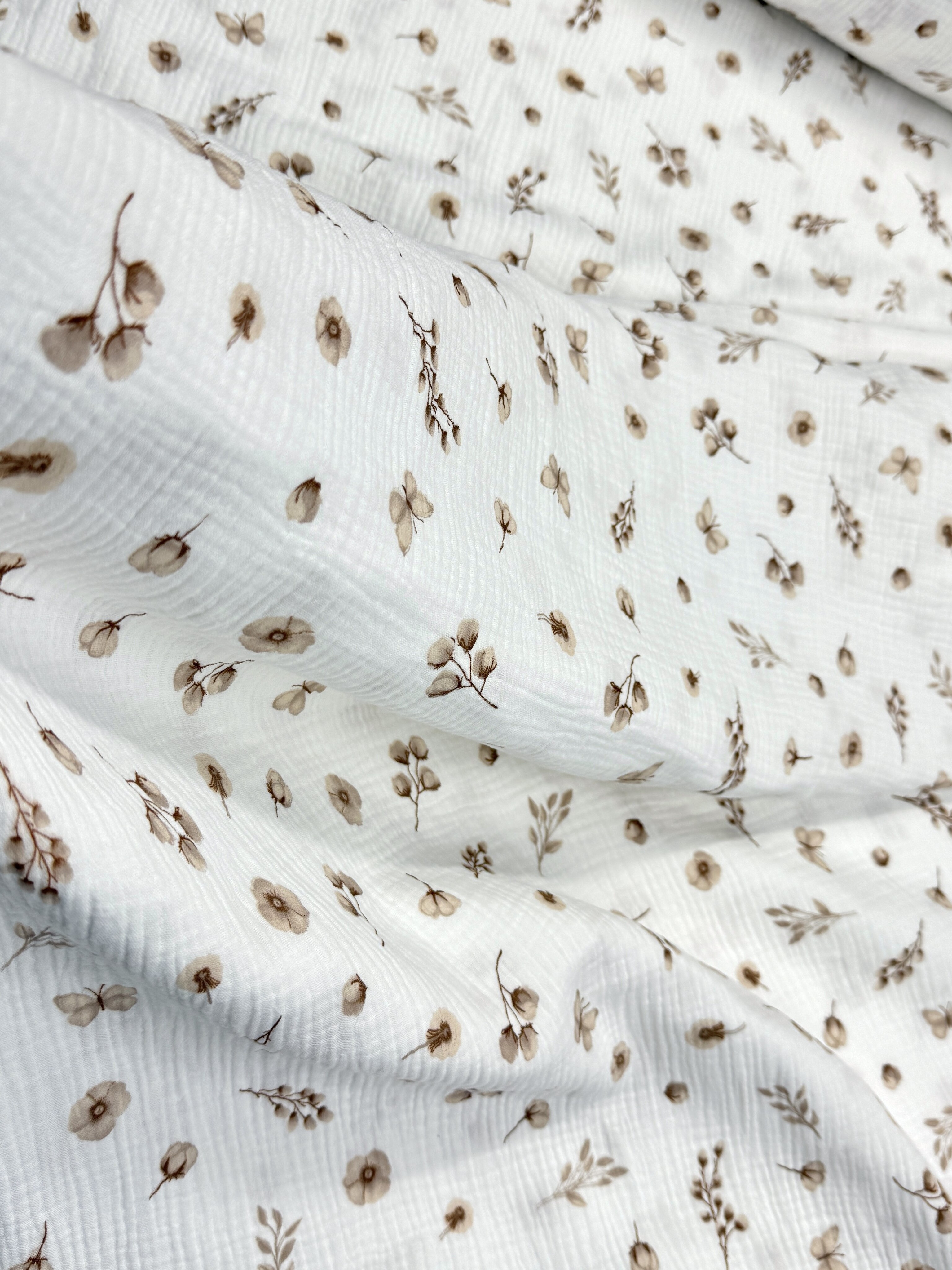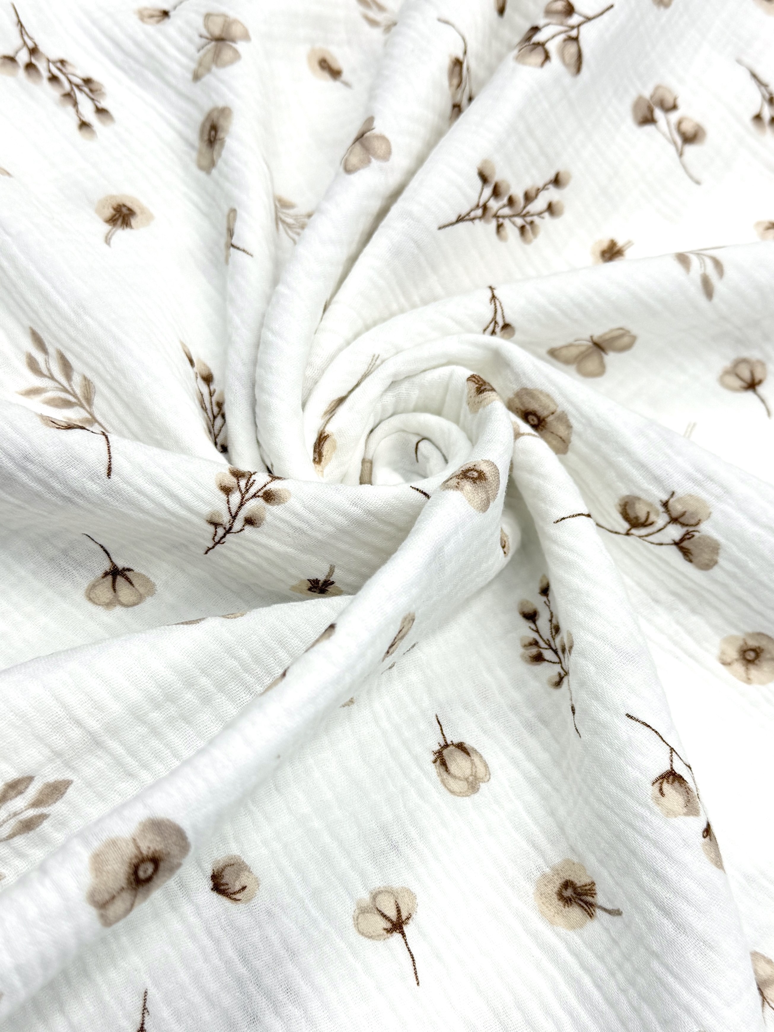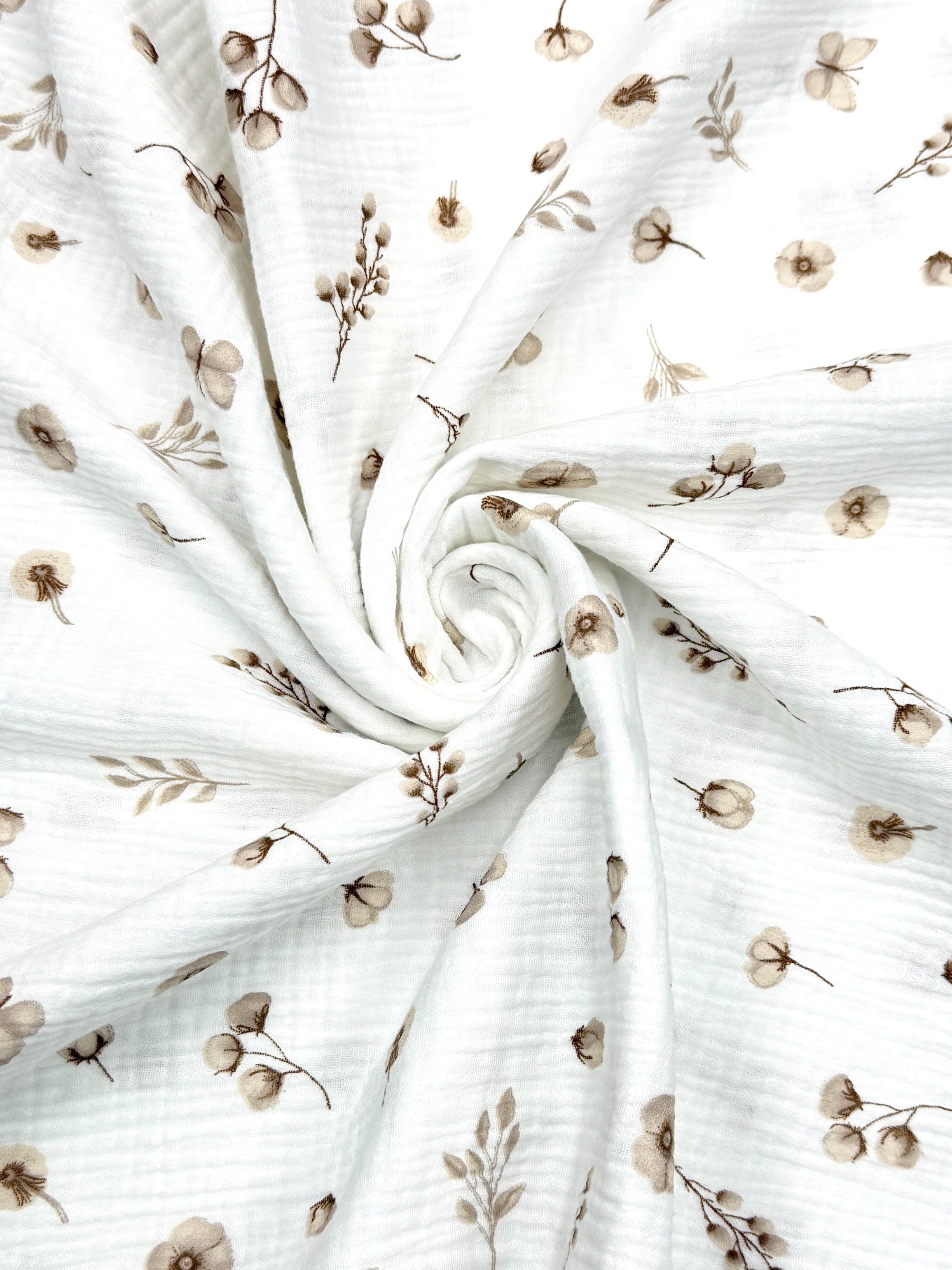 Несмотря на свою воздушность, хлопковый муслин – долговечная и прочная ткань. Хорошо драпируется и быстро высыхает. Рекомендуемый режим стирки - деликатные ткани (30-40°).